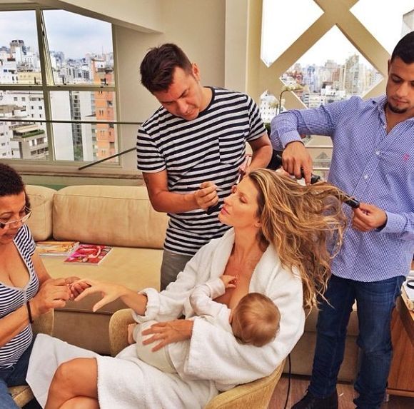 사진 속 지젤 번천은 여러 명의 스타일리스트들에게 손톱 관리와 메이크업, 머리 손질을 받고 있다. 특히 남성 스타일리스들 앞에서도 당당하게 모유 수유를 하고 있어 눈길을 끈다.