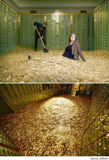돈 속에서 수영 사진은 스위스 폴크스방크에서 사용됐던 '대형 금고'의 모습으로, 스웨덴의 한 고급 상품 전문 쇼핑몰에 매물로 나와있다.