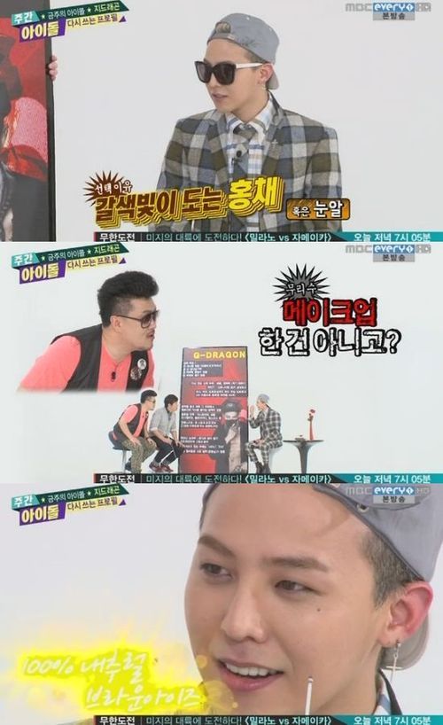 지드래곤은 11일 오후 방송된 MBC에브리원 '주간 아이돌'에서 자신의 프로필을 살피던 중 "눈코입 중에서는 어디가 에쁘냐"는 정형돈의 말에 "눈알"이라고 답했다.