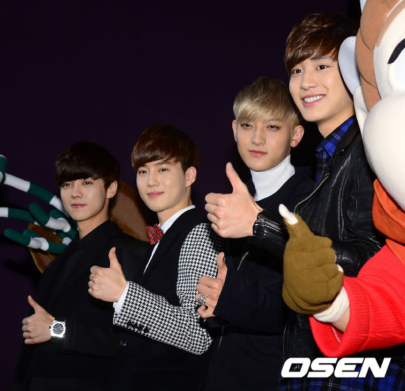 VIP 시사회에 참석한 EXO 루한, 수호, 타오, 찬열이 포토타임을 갖고 있다.
