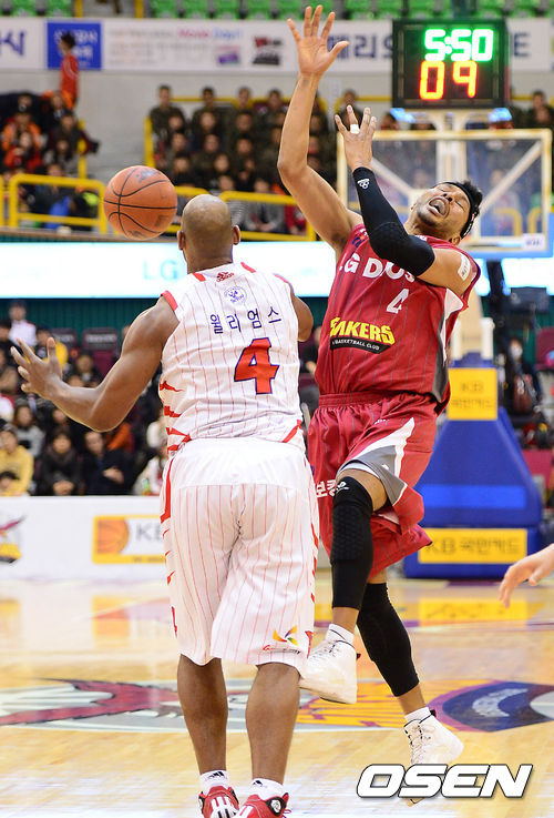 3쿼터 LG 문태종이 오리온스 윌리엄스의 반칙에 당하고 있다.