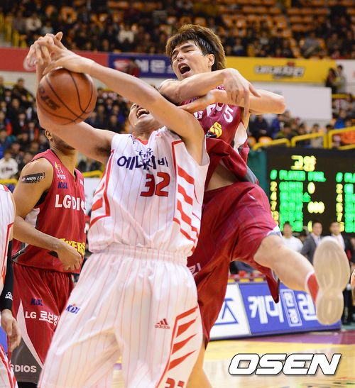 3쿼터 LG 김종규와 오리온스 김승원이 리바운드 다툼을 하고 있다.