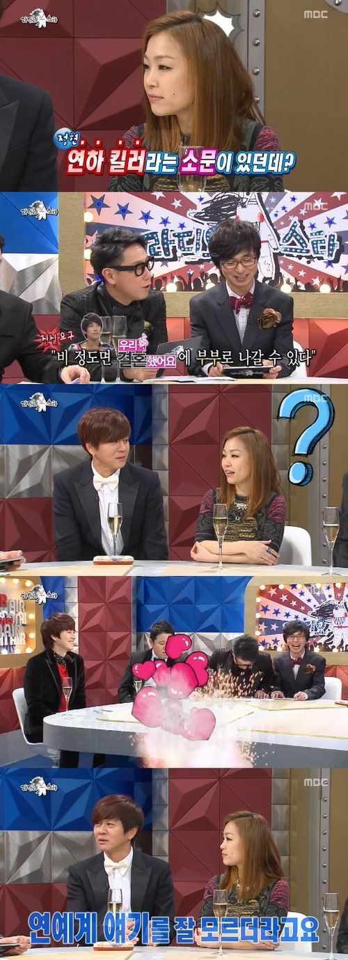 이에 MC들은 비와 사귀고 있는 김태희를 언급했다. 그러나 지금까지 두 사람의 열애사실을 몰랐던 박정현은 “몰랐다. 정말 예쁜 커플이다”라고 해맑게 축하해 웃음을 자아냈다.