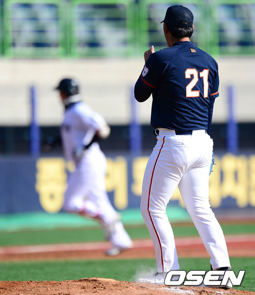 3회초 1사에서 동성고 이원석에게 솔로포를 허용한 성남고 정대현이 아쉬워하고 있다.