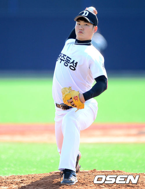 2회말 동성고 문동욱이 힘차게 공을 던지고 있다.
