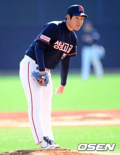 1회초 성남고 정대현이 동성고 이원석에 희생플라이 실점을 허용하며 아쉬워하고 있다.