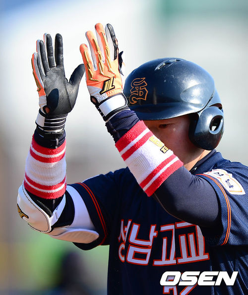6회말 2사 2,3루에서 성남고 최경환이 적시타를 치고 환호하고 있다.