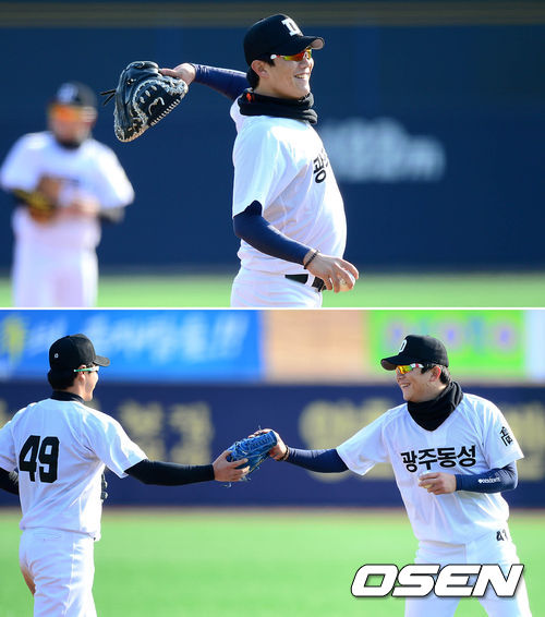 포수 미트를 착용하고 급하게 마운드에 오른 동성고 양현종이 동료에게 투수 글러브를 건네받고 있다./sunday@osen.co.kr