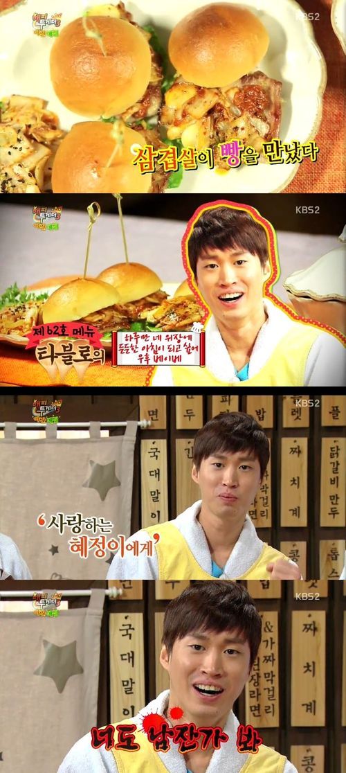 타블로는 12일 오후 방송된 KBS 2TV '해피투게더 시즌3'(이하 '해피투게더3')에서 부인 강혜정, 딸 하루와 함께 해먹는다는 삼겹살을 넣은 샌드위치를 선보여 야간메뉴로 등록시키는 데 성공했다.
