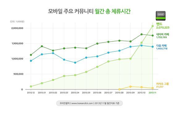 시장조사업체 닐슨코리안클릭에 따르면 지난 11월 ‘밴드’의 총 체류시간은 20억 분으로 올해 1월 대비 무려 835% 이상의 성장을 기록해, ‘네이버카페’ 17억 분, 다음카페 14억 분보다 앞선 것으로 집계됐다.