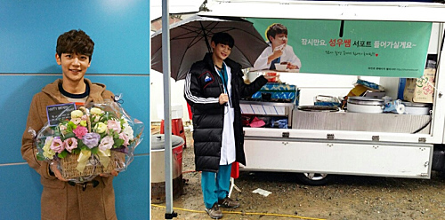공개된 첫번째 사진 속 민호는 꽃바구니를 들고 카메라를 향해 환한 미소를 짓고 있다. 두 번째 사진에는 우산을 쓴 채 팬들이 준비한 밥차를 소개하는 포즈를 취하고 있어 눈길을 끈다.