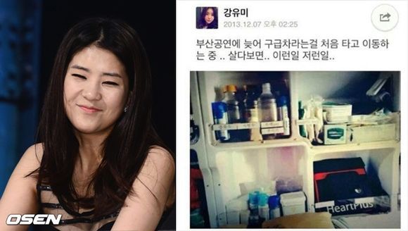 앞서 강유미는 지난 7일 자신의 SNS를 통해 "부산공연에 늦어 구급차라는 걸 처음 타고 이동하는 중"이라며 "살다보면 이런 일, 저런 일…"이라는 글과 함께 구급차 내부 인증사진을 올렸다.