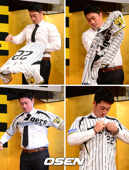13일 오후 일본 오사카 리츠칼튼 호텔에서 진행된 '오승환 한신 타이거스 입단 기자회견'에서 오승환이 한신 타이거스 유니폼을 입고 있다.
