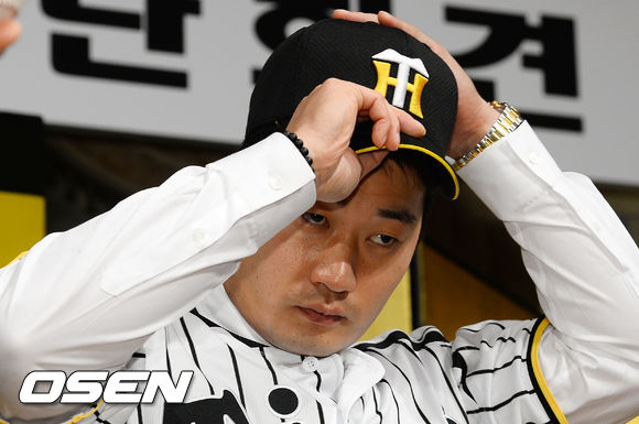 13일 오후 일본 오사카 리츠칼튼 호텔에서 진행된 '오승환 한신 타이거스 입단 기자회견'에서 오승환이 모자를 쓰고 있다.