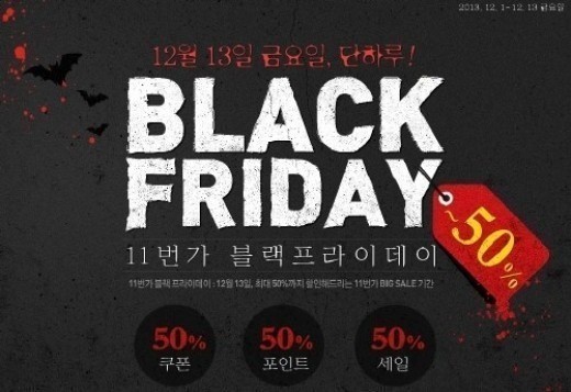 쇼핑 전문 사이트 11번가는 블랙프라이데이를 맞아 선착순 6만명 최대 50% 반값 쇼핑 이벤트를 마련했다. 11번가는 최대 50% 할인 혜택 뿐만 아니라 무료배송 쿠폰, 22개월 무이자, T멤버쉽 50% 등 다양한 혜택을 제공한다. 행사 기간은 13일 단 하루다.