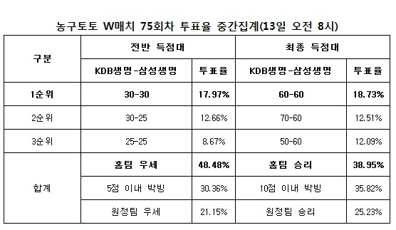 국민체육진흥공단(www.kspo.or.kr)이 발행하는 체육진흥투표권 수탁사업자인 스포츠토토 공식 온라인 발매사이트인 베트맨(www.betman.co.kr)이 오는 14일 오후 7시 구리시체육관에서 벌어지는 KDB생명-삼성생명전을 대상으로 한 농구토토 W매치 75회차 투표율을 중간 집계한 결과, 참가자의 38.95%는 KDB생명의 승리를 예상하는 것으로 나타났다.