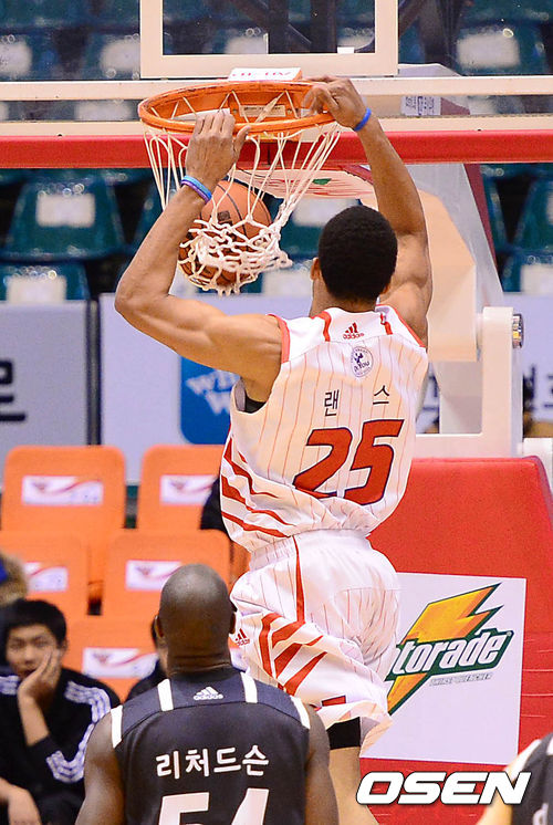 1쿼터 오리온스 랜스가 투핸드 덩크슛을 시도하고 있다.
