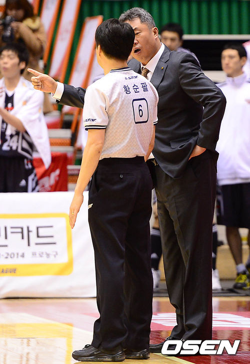 4쿼터 KT 전창진 감독이 심판진의 판정에 강하게 어필하고 있다.