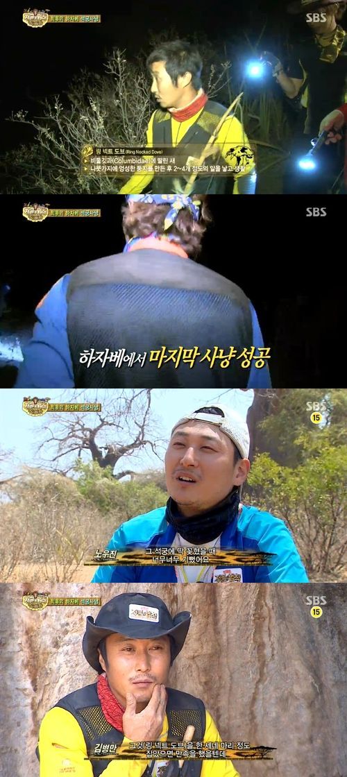 13일 방송된 SBS 예능 프로그램 '정글의 법칙 in 사바나'에서는 6시간 동안 공들인 석궁으로 새 사냥에 나선 병만족(김병만, 노우진, 류담, 김원준, 이규한, 한은정)의 모습이 담겼다. 어둠 속을 헤매던 병만족은 극적으로 석궁을 이용해 링 넥트 도브를 한 마리를 사냥하는 수확을 거뒀다.