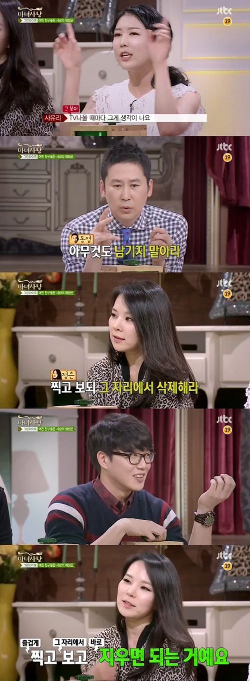 이때 사유리는 “아는 연예인 친구가 연예인이랑 사귀는데 남자가 알몸으로 춤추는 동영상을 저한테 보냈다. 갖고 있기 애매해서 삭제했지만 그 분이 TV나올 때마다 생각 난다”고 말했다.