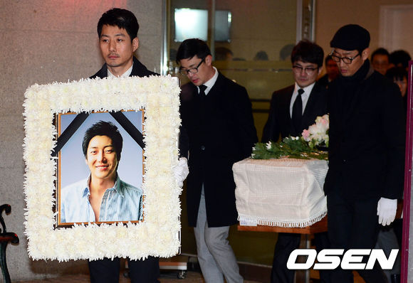 14일 오전 강남구 일원동 삼성서울병원 장례식장에서 故 김지훈의 발인식이 진행된 가운데, 듀크 김석민이 고인의 영정을 들고 운구차로 향하고 있다.