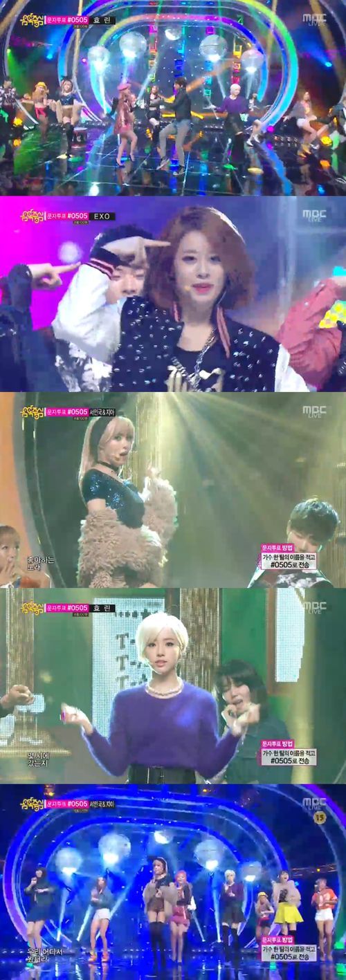 한편 '쇼! 음악중심'에는 EXO, 효린, 용준형, SECRET, T-ARA, 태진아, 로맨틱 J, 노을, Tasty, 나인뮤지스, 제이워크, M.I.B, 이동우, 혜이니, 대국남아, 케이헌터, LPG, 알파벳, Mr.Mr, Lush 등이 무대를 꾸몄다.