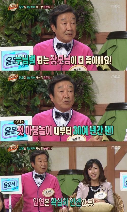 윤문식은 14일 방송된 MBC 예능 프로그램 '세바퀴'에 출연해 "지금 아내보다 누님뻘 장모님이 날 더 좋아한다. 내가 1981년에 첫 마당놀이를 할 때부터 이후 30년 간 한 번도 안 빼놓고 보러 왔다더라"고 말했다.