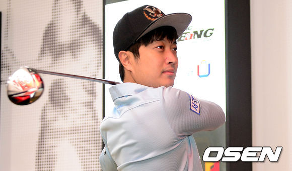 개그맨 정명훈이 힘차게 스윙을 하고 있다.