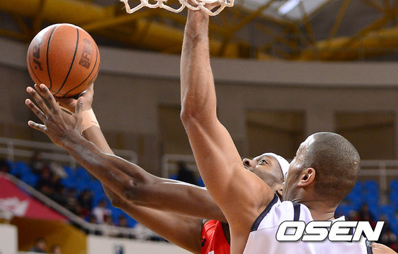 2쿼터 모비스 벤슨이 KT 클라크의 슛블록을 피해 슛을 시도하고 있다.