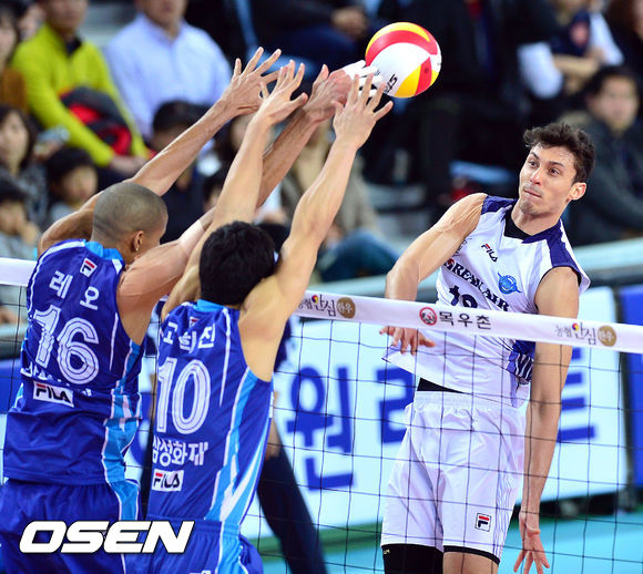 15일 오후 인천 계양체육관에서 열린 '2013-2014 NH농협 V리그' 남자부 대한항공과 삼성화재의 경기, 2세트 대한항공 마이클이 삼성화재 레오의 블로킹에 막히고 있다,.