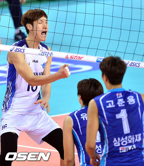 15일 오후 인천 계양체육관에서 열린 '2013-2014 NH농협 V리그' 남자부 대한항공과 삼성화재의 경기, 2세트 대한항공 진상헌이 블로킹 성공후 환호하고 있다.
