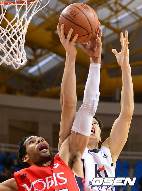 3쿼터 모비스 문태영과 KT 장재석이 리바운드 다툼을 하고 있다.
