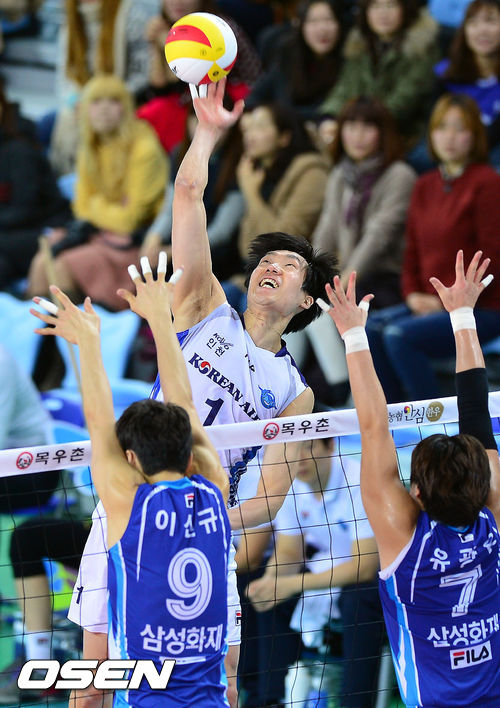 15일 오후 인천 계양체육관에서 열린 '2013-2014 NH농협 V리그' 남자부 대한항공과 삼성화재의 경기, 2세트 대한항공 신영수가 강타를 날리고 있다.