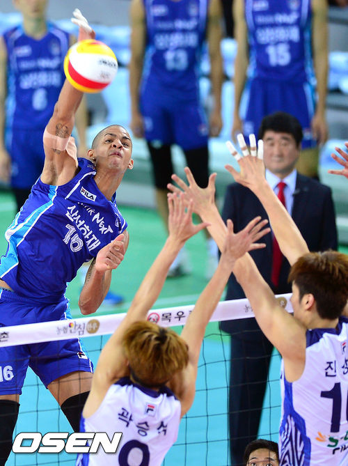 15일 오후 인천 계양체육관에서 열린 '2013-2014 NH농협 V리그' 남자부 대한항공과 삼성화재의 경기, 1세트 삼성화재 레오가 강타를 날리고 있다.