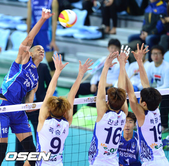 15일 오후 인천 계양체육관에서 열린 '2013-2014 NH농협 V리그' 남자부 대한항공과 삼성화재의 경기, 1세트 삼성화재 레오가 강타를 날리고 있다.