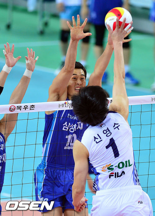 15일 오후 인천 계양체육관에서 열린 '2013-2014 NH농협 V리그' 남자부 대한항공과 삼성화재의 경기, 1세트 삼성화재 고희진이 신영수의 공격을 블로킹 시도하고 있다.