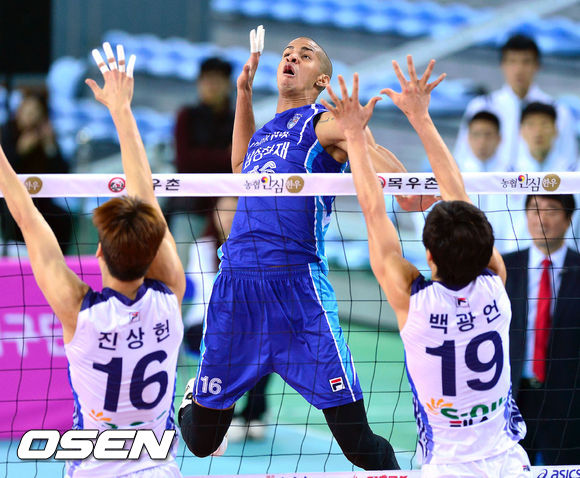 15일 오후 인천 계양체육관에서 열린 '2013-2014 NH농협 V리그' 남자부 대한항공과 삼성화재의 경기, 1세트 삼성화재 레오가 강타를 날리고 있다.