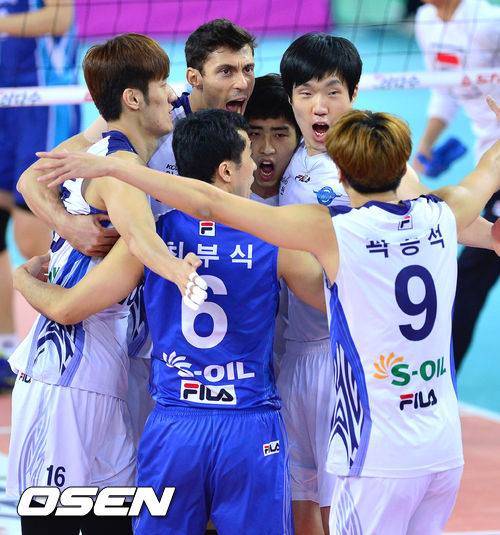 15일 오후 인천 계양체육관에서 열린 '2013-2014 NH농협 V리그' 남자부 대한항공과 삼성화재의 경기, 1세트 대한항공 선수들이 공격 성공후 기뻐하고 있다