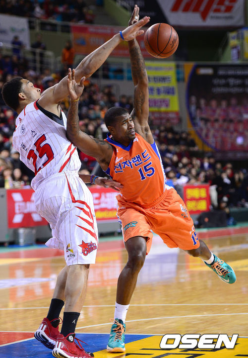 15일 오후 인천 삼산월드체육관에서 열린 '2013-2014 국민카드 프로농구' 인천 전자랜드와 고양 오리온스의 경기, 1쿼터 전자랜드 포웰이 오리온스 렌스의 반칙에 걸려 공을 놓치고 있다.