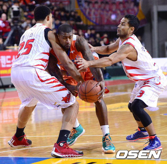 15일 오후 인천 삼산월드체육관에서 열린 '2013-2014 국민카드 프로농구' 인천 전자랜드와 고양 오리온스의 경기, 1쿼터 전자랜드 포웰이 오리온스 렌스의 반칙에 걸려 공을 놓치고 있다.