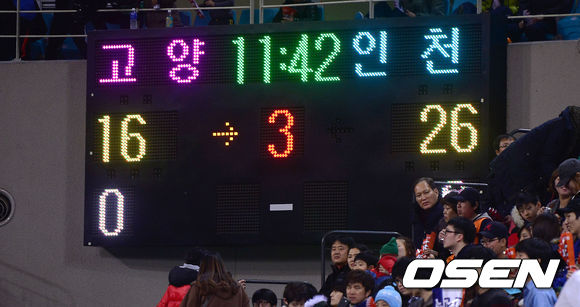 15일 오후 인천 삼산월드체육관에서 열린 '2013-2014 국민카드 프로농구' 인천 전자랜드와 고양 오리온스의 경기, 전반전까지 양팀 합산 최소점 42점으로 종전기록은 45점이다.