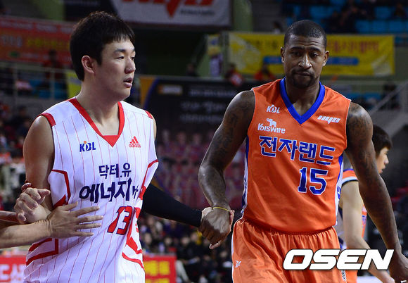 15일 오후 인천 삼산월드체육관에서 열린 '2013-2014 국민카드 프로농구' 인천 전자랜드와 고양 오리온스의 경기, 4쿼터 전자랜드 포웰과 김동욱이 신경전을 벌이고 있다.