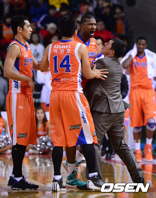 15일 오후 인천 삼산월드체육관에서 열린 '2013-2014 국민카드 프로농구' 인천 전자랜드와 고양 오리온스의 경기, 4쿼터 전자랜드 포웰이 심판의 판정에 항의하고 있다.