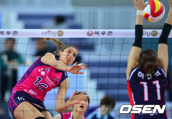 15일 오후 인천 계양체육관에서 열린 '2013-2014 NH농협 V리그' 여자부 흥국생명과 KGC 인삼공사의 경기 2세트, 흥국생명 바실레바가 강타를 날리고 있다.