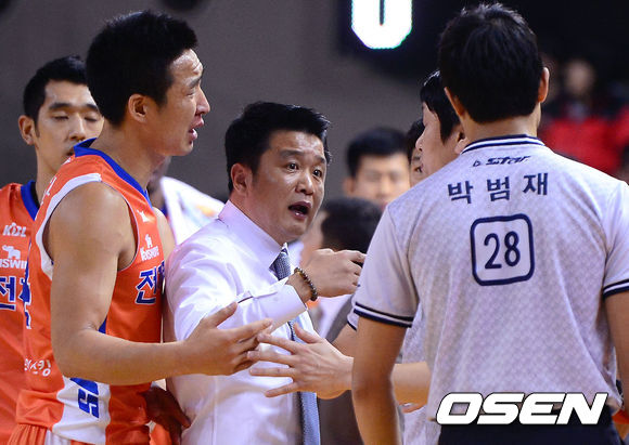 15일 오후 인천 삼산월드체육관에서 열린 '2013-2014 국민카드 프로농구' 인천 전자랜드와 고양 오리온스의 경기, 4쿼터 전자랜드 유도훈 감독이 포웰의 퇴장 판정에 항의하고 있다.