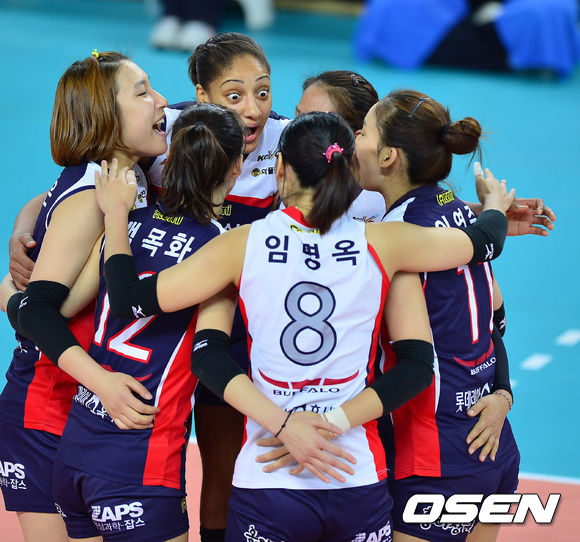 15일 오후 인천 계양체육관에서 열린 '2013-2014 NH농협 V리그' 여자부 흥국생명과 KGC 인삼공사의 경기, 2세트 KGC 인삼공사 조이스가 공격 성공후 동료들과 기쁨을 나누고 있다.