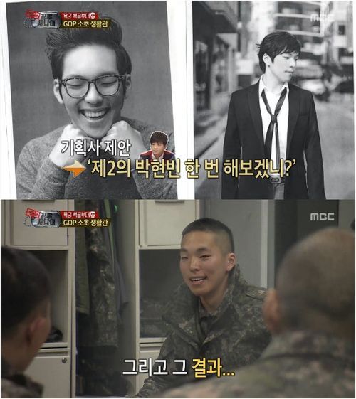 김정중 상병은 “소속사에서 제 2의 박현빈이 되자면서 트로트 가수를 제안했다”면서 “앨범을 냈는데 소득이 없었다. 그래서 바로 GOP로 왔다”고 가수로 활동했던 사실을 털어놨다.