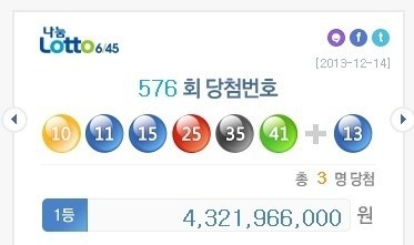 따라서 1등 당첨자 3명은 무려 43억 2196만 원씩의 당첨금을 각각 수령하게 된다. 로또 576회 6개 당첨번호 중 5개 번호와 보너스 번호를 맞춘 2등은 총 54명으로, 각각 4001만 8204원 받게 된다. 로또 576회 2등 보너스 번호는 '13'이다.