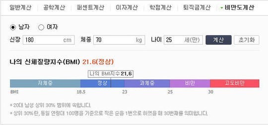 비만도 계산기는 간단하게 자신의 신장과 체중을 입력하면 바로 자신이 비만인지 아닌지, 정상인 지를 체크할 수 있어 큰 인기를 얻고 있다.