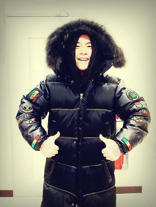 공개된 사진 속 스컬은 하하가 디자인한 두꺼운 검정 패딩을 입고 환한 미소로 카메라를 응시하고 있다. 팔 부분에 붙어있는 레게 스타일의 문양들이 눈길을 끈다.